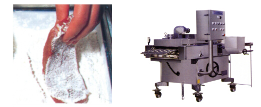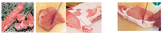 撤除里脊肉的薄皮及筋;把肉切成¢4cm×2cm厚(30g)的肉塊,把把肉與脂肪之間的筋切除。